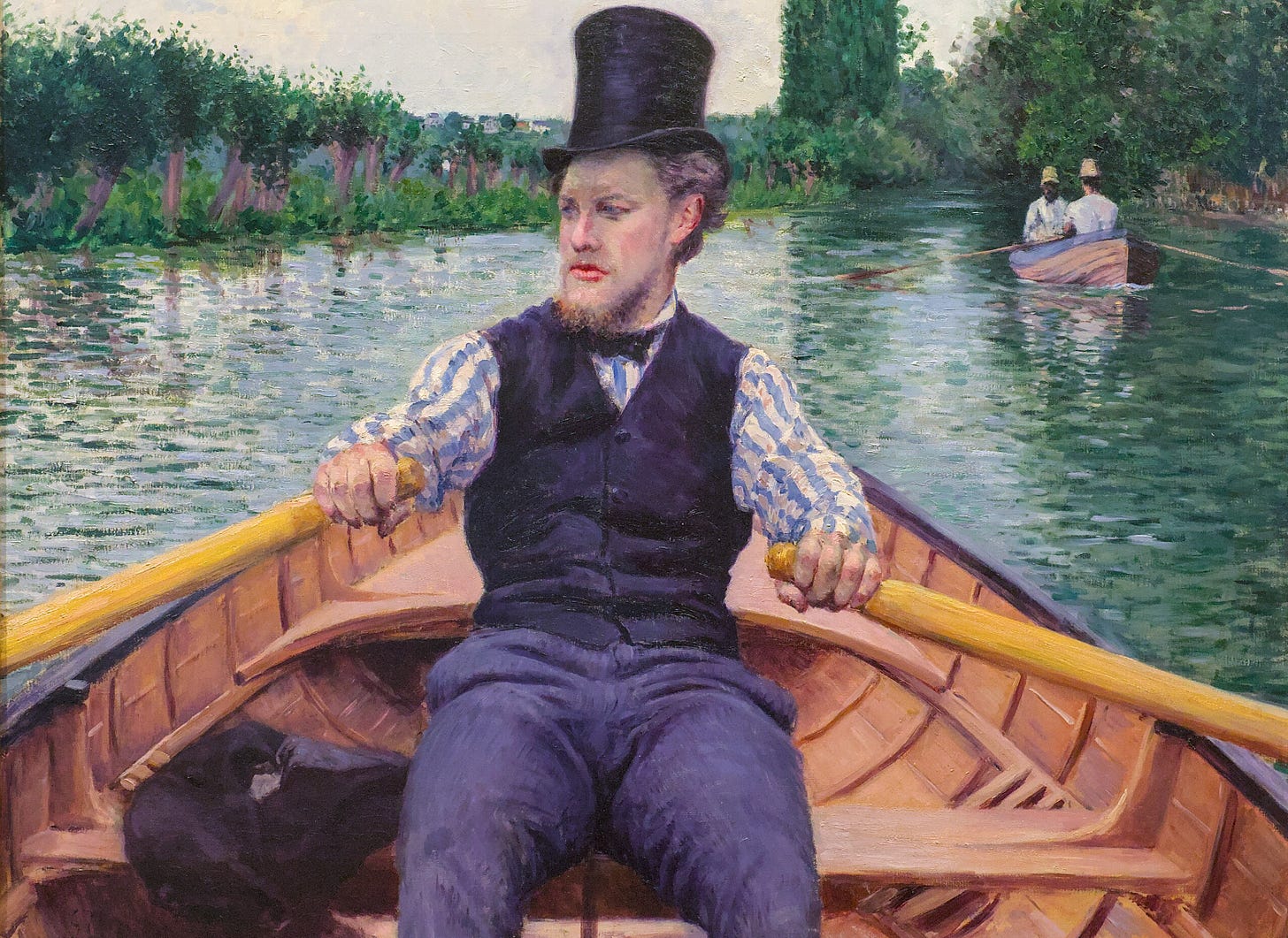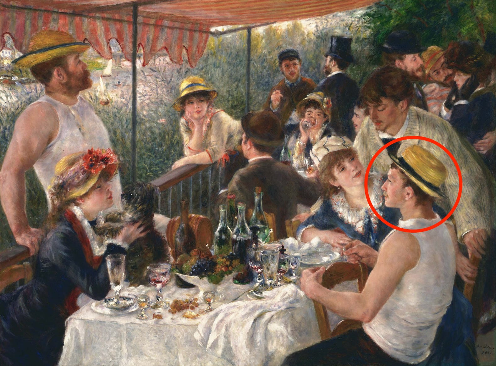 In his 1881 painting The Luncheon of the Boating Party (Le Déjeuner des canotiers), Pierre-Auguste Renoir depicts a number of his friends. In particular, who is the man wearing a straw boater’s hat, highlighted below? A painter himself, this man was featured at an exhibition at the Art Institute of Chicago last year that offered a survey of some of his most important work, including what probably is his most famous painting (already on permanent display at the Art Institute) as well as the painting shown below, which usually is on display at the Musée d’Orsay. As the painting shown is titled The Boating Party, I wonder if it was meant to show a snippet of the pre-party activities of the same group depicted by Renoir three years later.