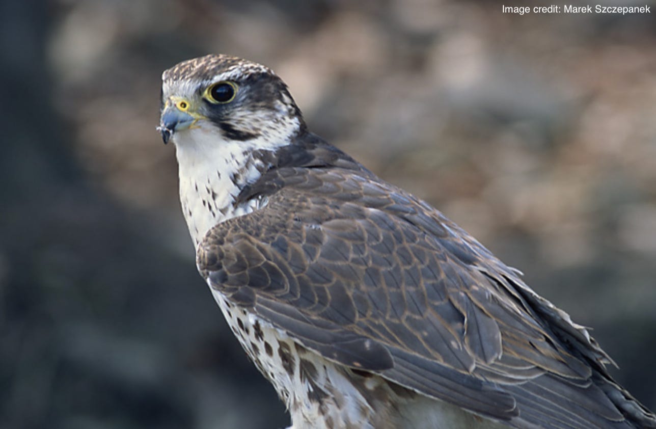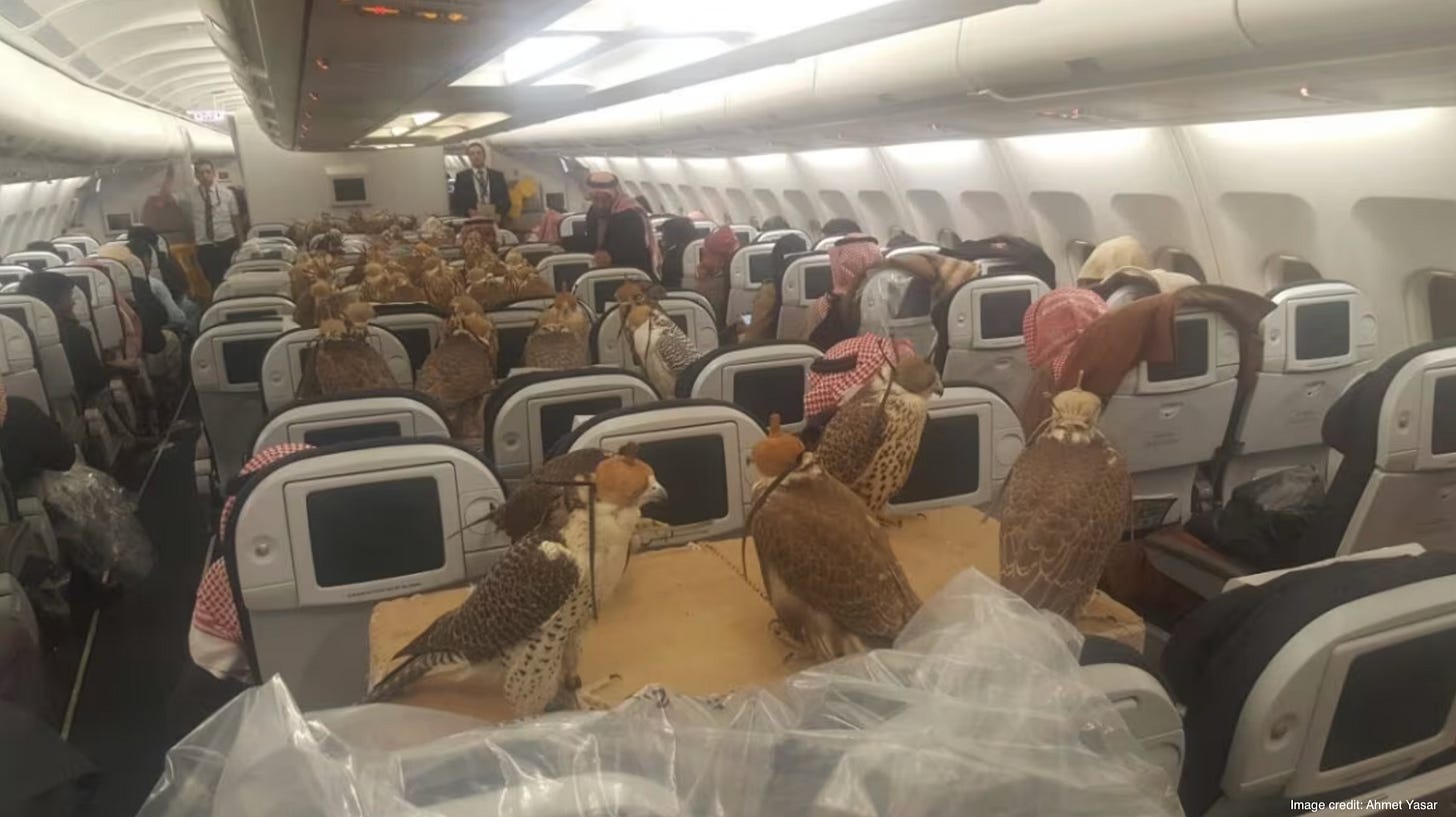 Some airlines allow for carry-on luggage, while others will even permit carrion. The photograph below, from 2017, captured a not-uncommon occurrence in the Middle East - a plane rented out to transport falcons, in the instance shown for a competition held in Jeddah. Among those on the manifest were gyrfalcons, peregrine falcons, and members of what other species of falcon? This particular bird (one example is shown second) is the second fastest bird in level flight after the swift, and it only trails the peregrine falcon and the golden eagle in dive speed. Those attributes might explain why it is the most expensive of the birds used in falconry to purchase (going for millions of dollars) as well as why it is the national bird of several Middle Eastern countries, including the United Arab Emirates.
