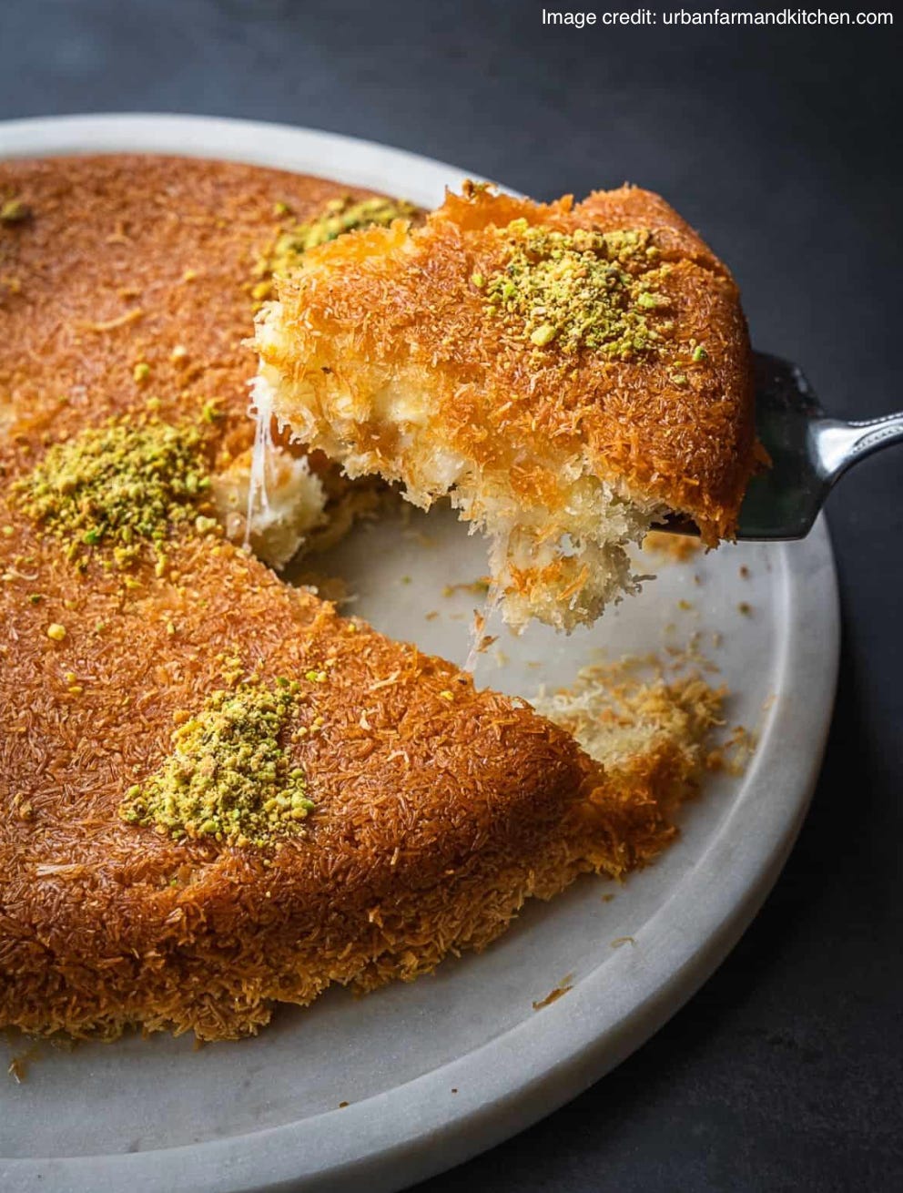 Its most distinctive ingredient is kadayif, which is phyllo dough shredded into fine strands. That pastry is heated in butter, with a cheese local to the Middle East, like Nabulsi or Akkawi, then added, along with sugar, water, and additional touches like rose water or pistachios. It is associated with the iftar of Ramadan in particular, as one origin story places its creation in Fatimid Egypt, when an unnamed caliph is said to have wanted a new food for his Ramadan feast. What is the name of this traditional Arab dessert (shown)?