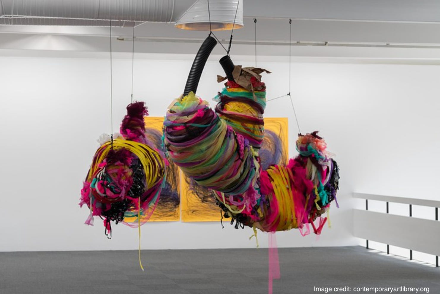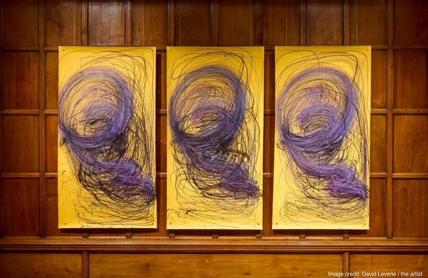 Her recent work tends to come in two forms: drawings of whirlpool-like images that usually come in pairs or trios, like that shown first below, or constructions made of materials wrapped into layers until they take a shape, like the work of wound fabric shown second below. The child of Nigerian immigrants, her recent Turner Prize win was especially newsworthy, as she is autistic. Which artist?