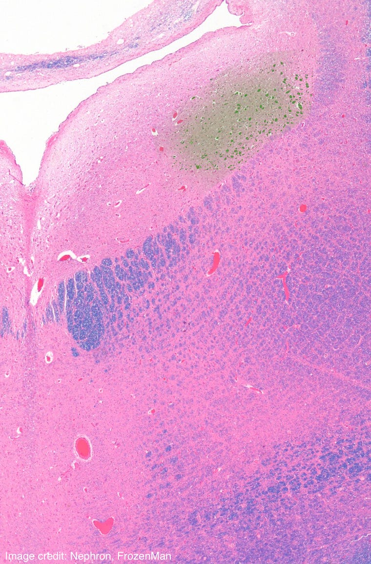 The histology slide shown has a particular region of the brain highlighted in green, oddly, with the white space near it being the fourth ventricle. Neurons projecting from this location go to many different parts of the brain, which makes sense given its importance in the wakefulness cycle and its involvement in the body’s stress response. This region gets its most distinctive histological feature from neuromelanin that accumulates secondary to the polymerization of norepinephrine - which also makes sense, given that this location is the primary area of synthesis of norepinephrine in the brain. What is the name for this particular region of the pons?