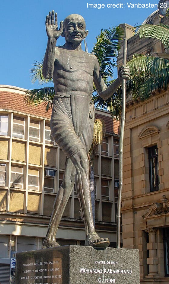 The “Crime Index” is a metric that combines different major crimes - like murder, rape, and robbery - into a single number in order to provide a sense of how dangerous a locale may be. As of 2026, what capital of KwaZulu-Natal Province has one of the highest numbers (if not the highest) in the world on that index, with over 84 such crimes per 100,000 citizens? It is somewhat ironic, then, that what is likely South Africa’s most notable monument to that great apostle of nonviolence, Mahatma Gandhi, is located in this city (see below). That is because it was this city where Gandhi was forcefully removed from a train in 1893, triggering his awakening to the discrimination that he faced because of his skin color and prompting him to develop his philosophy of nonviolent resistance.