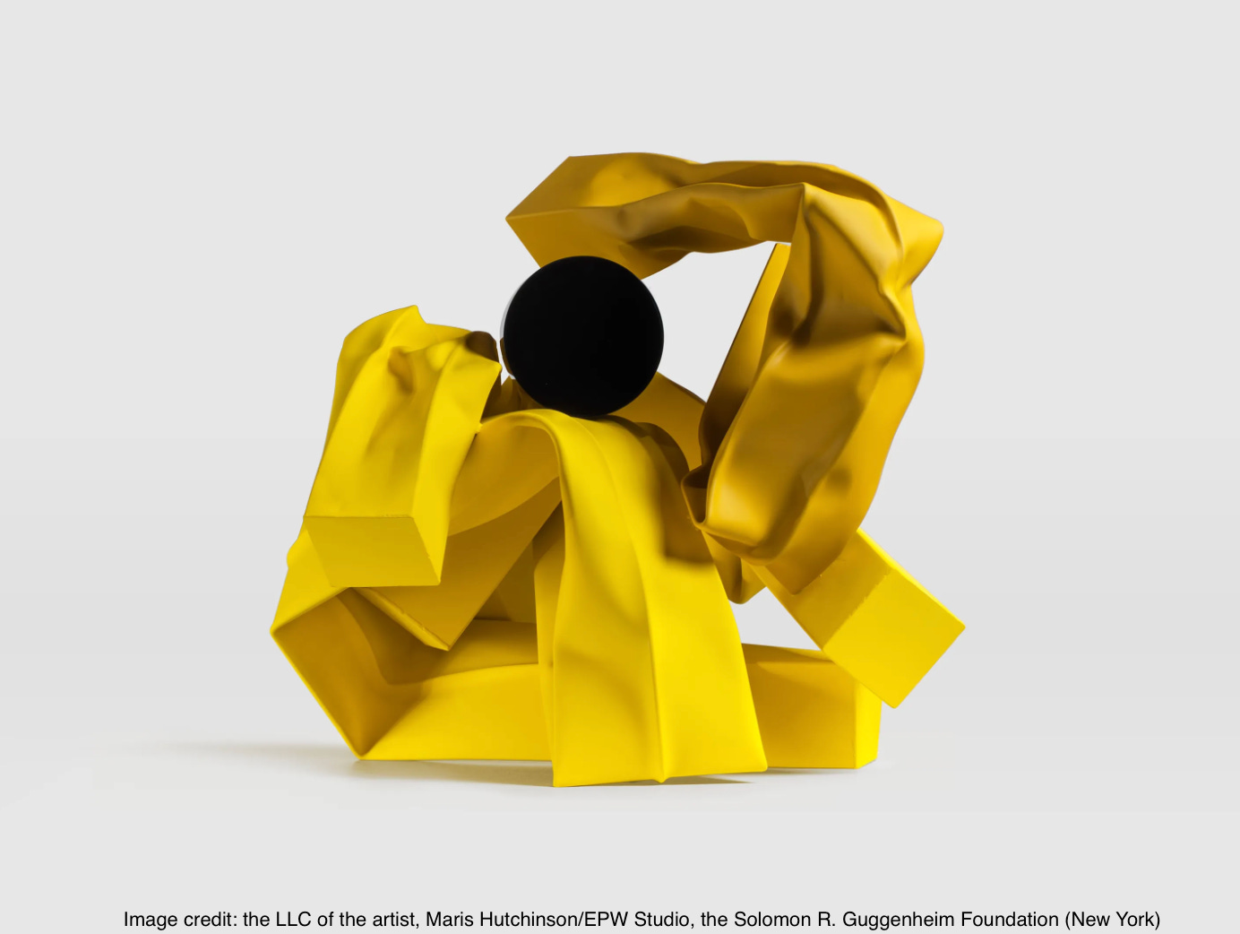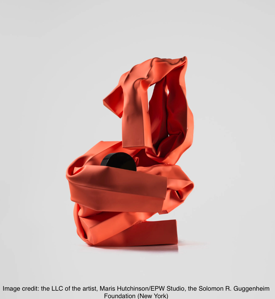 Currently at the Guggenheim in New York is the first major survey of what Geneva-born American sculptor? Shown first is a collection of several works by her, followed by images of Cutting Corners and Rich Mom. While the Guggenheim survey includes earlier somewhat more personal work as well, this artist has become more notable in recent years for works made of crushed metal like those featured below, as they have been praised for how they balance a sense of tremendous weight with fragility.