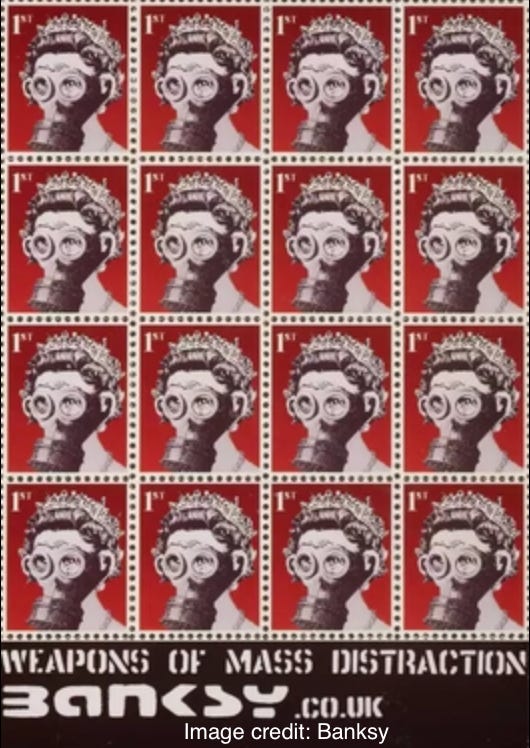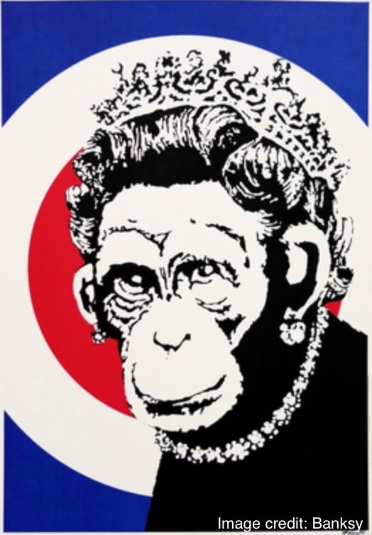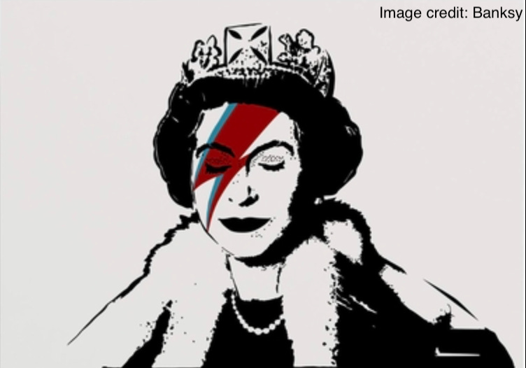David Jones, as in David Thomas “Davy” Jones, best known as the drummer for The Monkees. Banksy has at least three noteworthy depictions of Queen Elizabeth II: 2001’s Weapons of Mass Distraction (first), 2003’s Monkey Queen (second) and 2012’s Queen Ziggy (last), made for Elizabeth’s Diamond Jubilee and inspired by the Ziggy Stardust persona of David Bowie, born David Robert Jones.