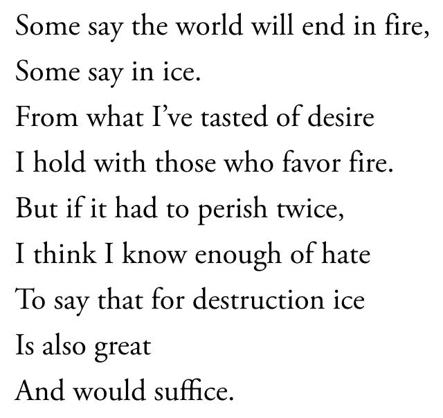 “Fire and Ice,” the 1920 poem by Robert Frost. Harlow Shapley was a noted astronomer, and on the occasion in question Frost continued to redirect Shapley away from regular party chit-chat towards a discussion about how the universe might end. Canto 32 of Inferno is where Dante and Virgil enter the bottommost portion of Hell - frozen Cocytus, where the fire of Hell transitions into ice. One scholar argues that the nine-lined, tapering nature of Frost’s poem is meant to invoke the structure of Dante’s Hell: