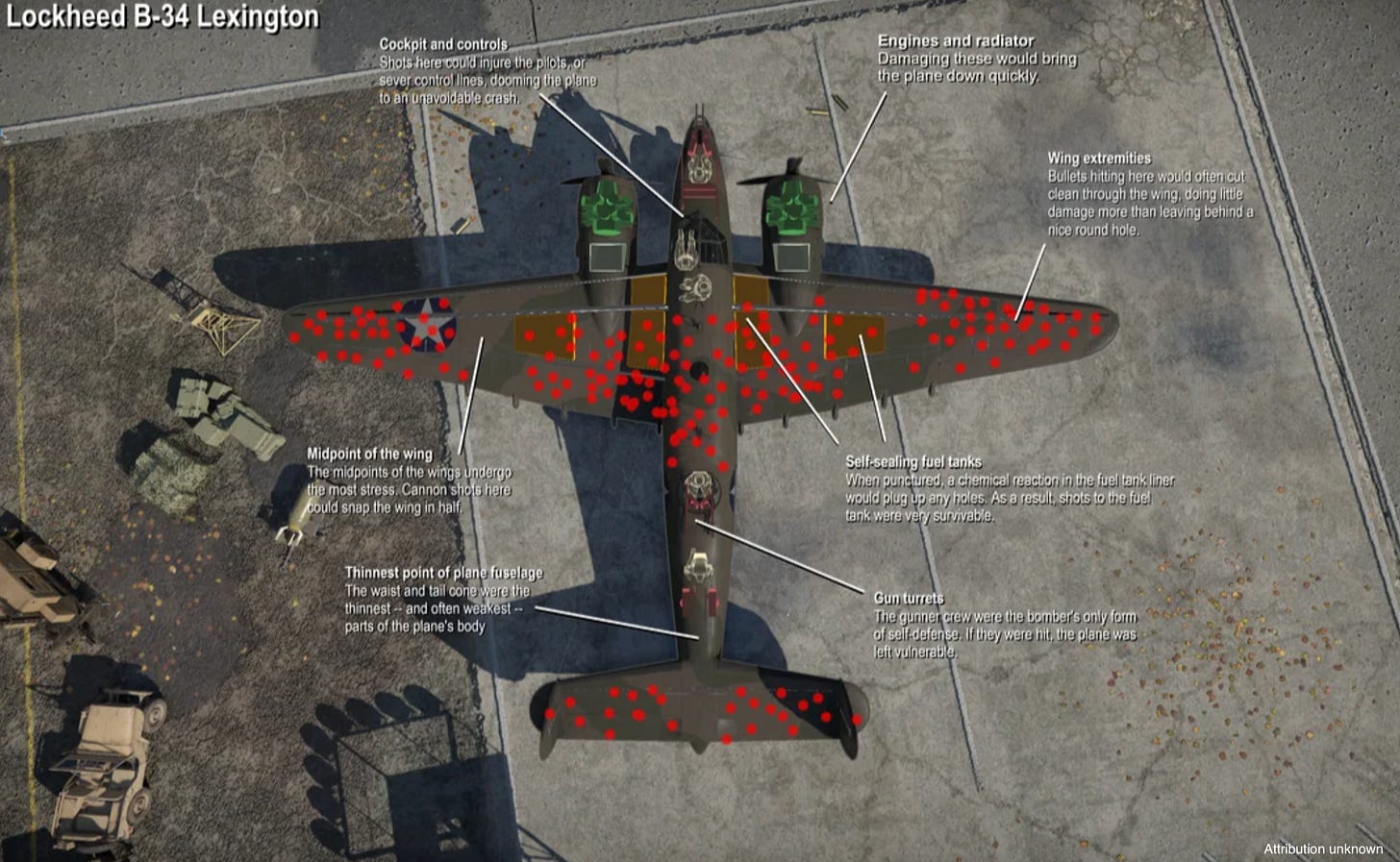 “Survivorship bias” is the fallacy where one only analyzes those samples that “survived” a particular selection criterion, meaning that you are likely excluding many samples that did not survive from your analysis - thus making your conclusions dubious, since those failures are likely important also. In Wald’s case, he famously analyzed the planes that made it back from battle during the Second War. The (probably speculative) graphic of such a plane is shown below. Others had used information like that shown below to conclude that the B-34 (and other planes) needed additional reinforcements to the wings, both front and back, as that seemed to be where bullets were striking these planes. But Wald pointed out that only the planes that returned had damage to the wings - meaning that the planes that did not make it back must have suffered damage to other locations, like where the engines were, so that any reinforcement to planes actually should be placed in those locations instead.