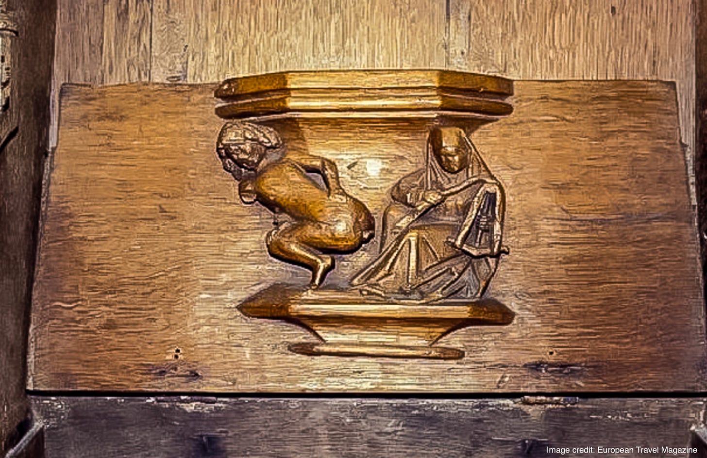 At the Church of Notre Dame in Rodez, France, you can find the below, um, depiction of a man exposing his anus to you, the viewer. While one of the cheekier (sorry) examples of such woodcraft, such an unconventional approach to art was not unheard of in medieval churches. The particular woodwork shown is part of an object that is also known as a “mercy seat.” What is the traditional term by which such mercy seats are called? Usually, the seat is left down, but it can be folded up, with designs like that below acting as a kind of resting spot for those leaning up against the seat (usually during times of prolonged prayer). Since the chair was usually left down, that meant that unusual designs like that shown below would remain hidden - which is how artists were afforded the opportunity to create depictions otherwise not seen in churches. Add two letters to the answer sought, and you get a word which appears as the English language title of a waggish 2024 black comedy directed by Alain Guiraudie.